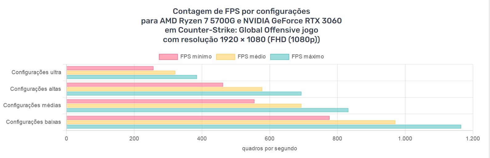 Com estes dois componentes: Processador e placa de vídeo dedicada de médio porte, o CS:GO vai rodar em Full HD com o máximo de FPS no Counter Striker com até 300 FPS (veja gráfico acima).